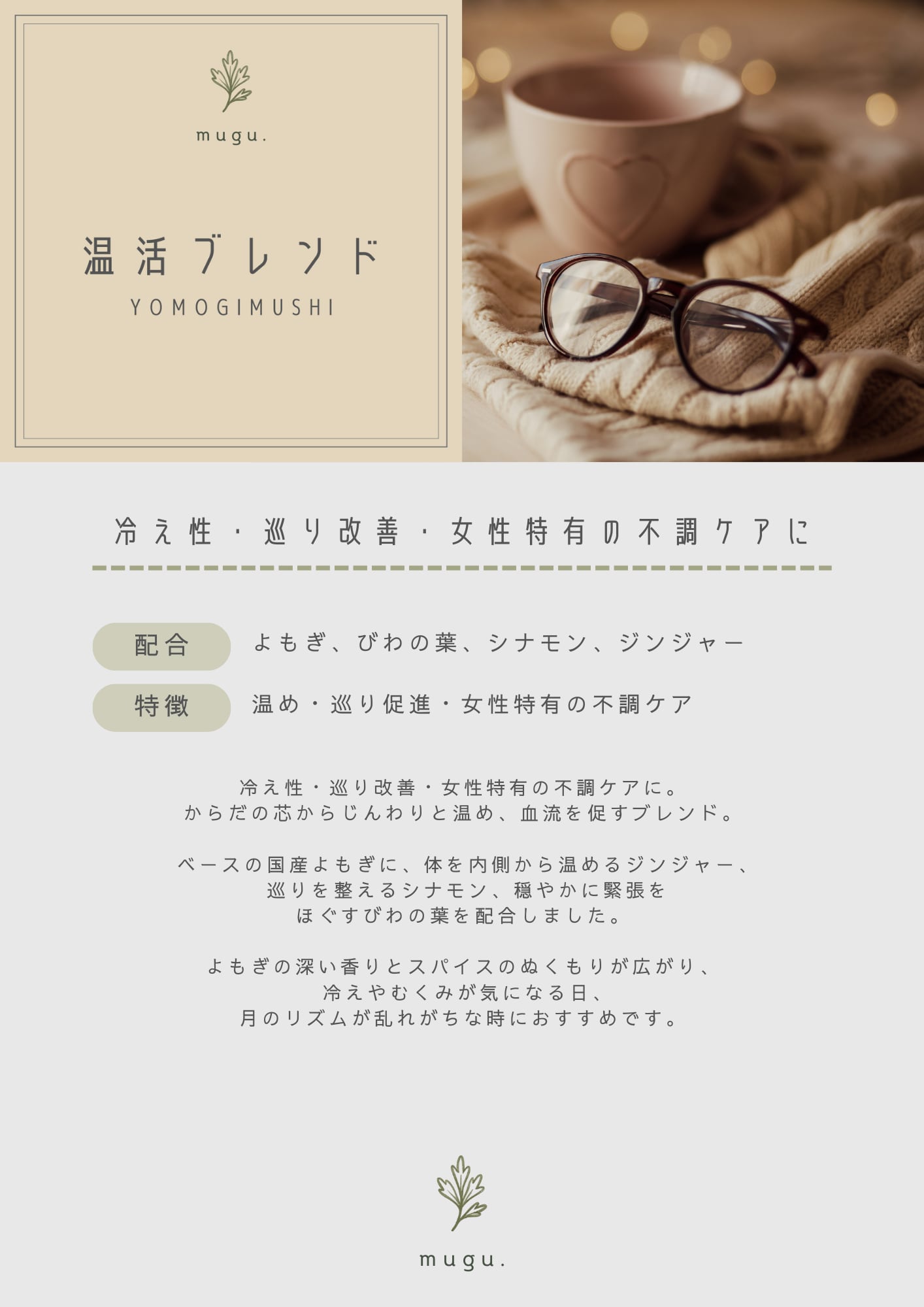 こちらの温活ブレンドは、よもぎにびわの葉・シナモン・ジンジャーをバランスよく配合した、